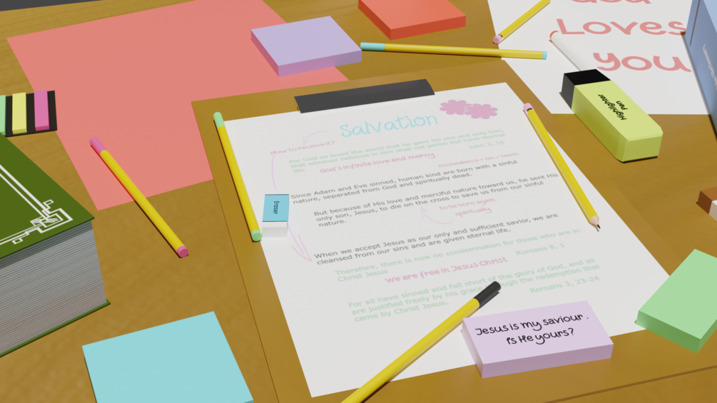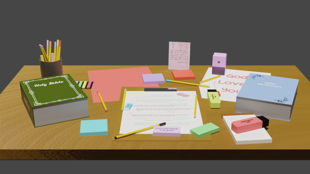 A real-world bible study scenario that contains books like the bible and bible dictionary and supplies like pencils, paper, notepads, sticky notes, and more. This is part of my Real Life Scenarios collection which contains 3D models about everyday life scenarios. This 3D model is ready to be used as a prop in any project such as a church presentation.