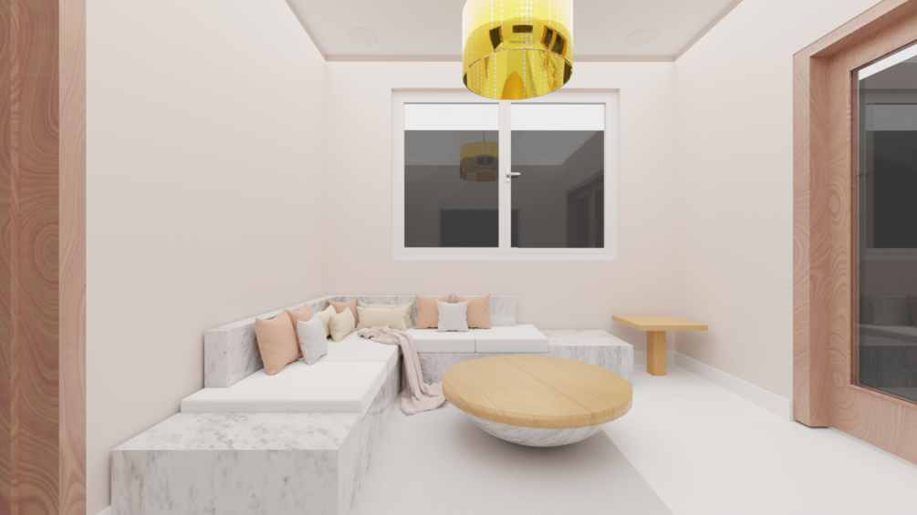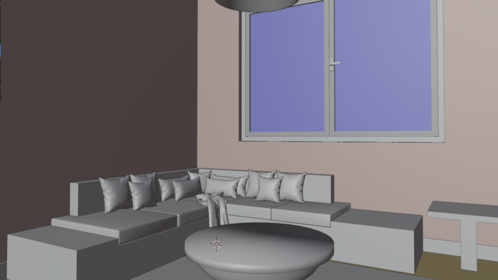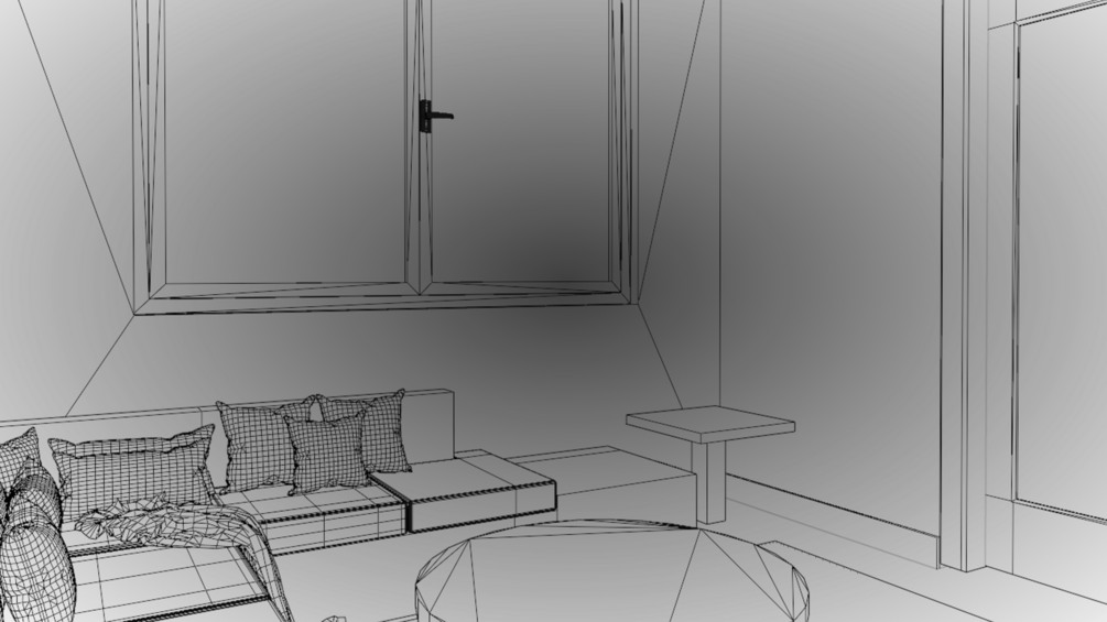 Rendered images (rendered in Cycles), solid view images, wireframe view images and promotional videos that shows several views of the living room.