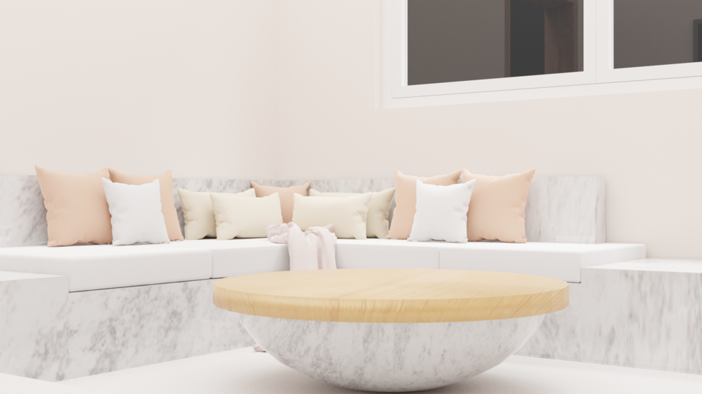 A real-world scale small living room that contains: 1 L-shaped sofa, sofa seater cushions, sofa decor cushions, blanket, tables, and a TV. This product also includes the living room decor set 3D model (comes in a different file. Go to notes to see more information about this) for free!
